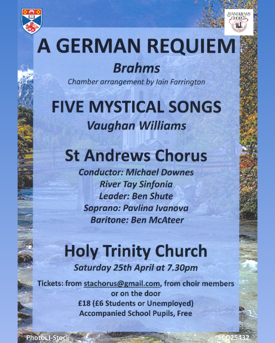 Programme - Brahms - A German Requiem (chamber arrangement by Jain Farrington) Five Mystical Songs - Vaughan Williams St Andrews Chorus Conductor: Michael Downes River Tay Sinfonia Leader: Ben Shute Soprano: Pavlina lvanova (soprano) Ben McAteer (baritone) Tickets: from stachorus@gmail.com, from choir members or on the door £18 {£6 Students or Unemployed) Accompanied School Pupils […]